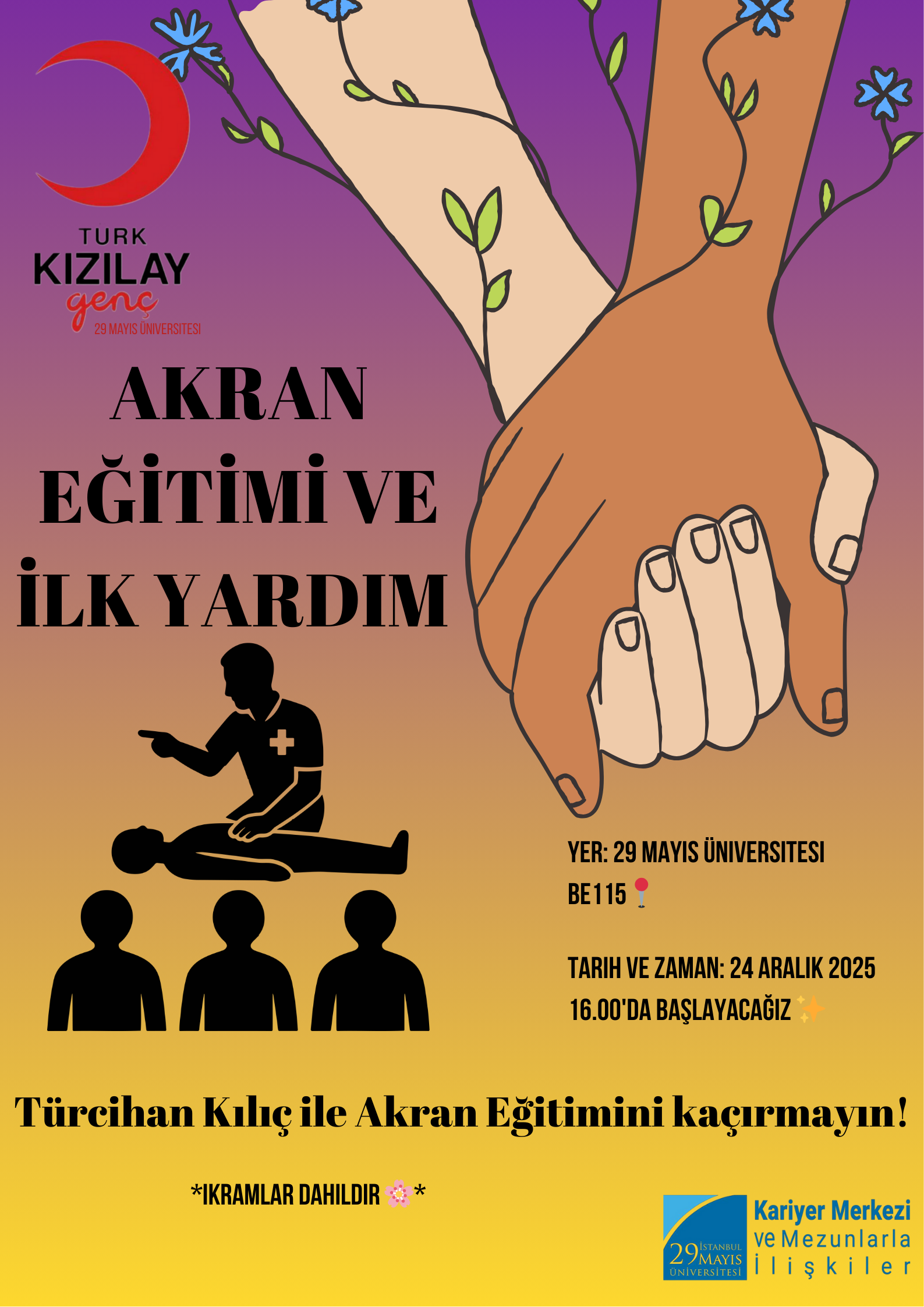Kariyer Merkezi iş birliğiyle, Kariyer Merkezi bünyesinde faaliyet gösteren kulüpler tarafından düzenlenen Akran Eğitimi ve İlk Yardım Eğitimi, 24 Aralık’ta BE115 salonunda gerçekleştirilmiştir.